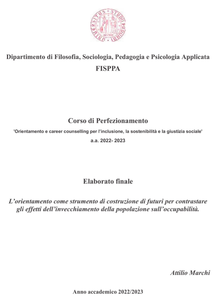 Nel 2023 Attilio Marchi, iscritto al corso di perfezionamento in “Orientamento e career counselling per l’inclusione, la sostenibilità e la giustizia sociale”presso il Dipartimento di Filosofia, Sociologia, Pedagogia e Psicologia Applicata dell’Università di Padova, chiese ad ATDAL Over 40 di suggerirgli documenti, saggi e testi da consultare per redigere l’elaborato finale su un argomento oggetto del corso. Il titolo della ricerca è “L’orientamento come strumento di costruzione di futuri per contrastare gli effetti dell’invecchiamento della popolazione sull’occupabilità”.